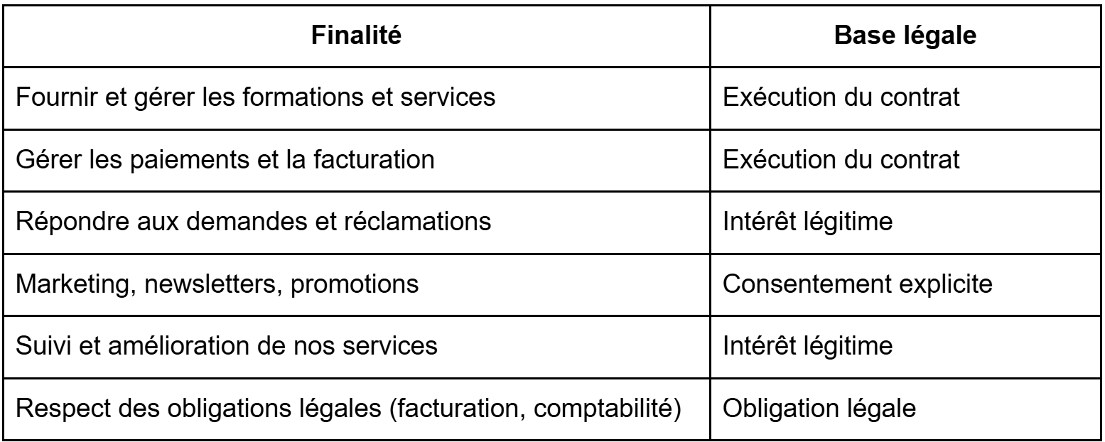 - Vos données peuvent être traitées par des sous-traitants tels que LearnWorlds (plateforme LMS), Stripe (paiement), AWS (hébergement), Sendgrid (emailing).